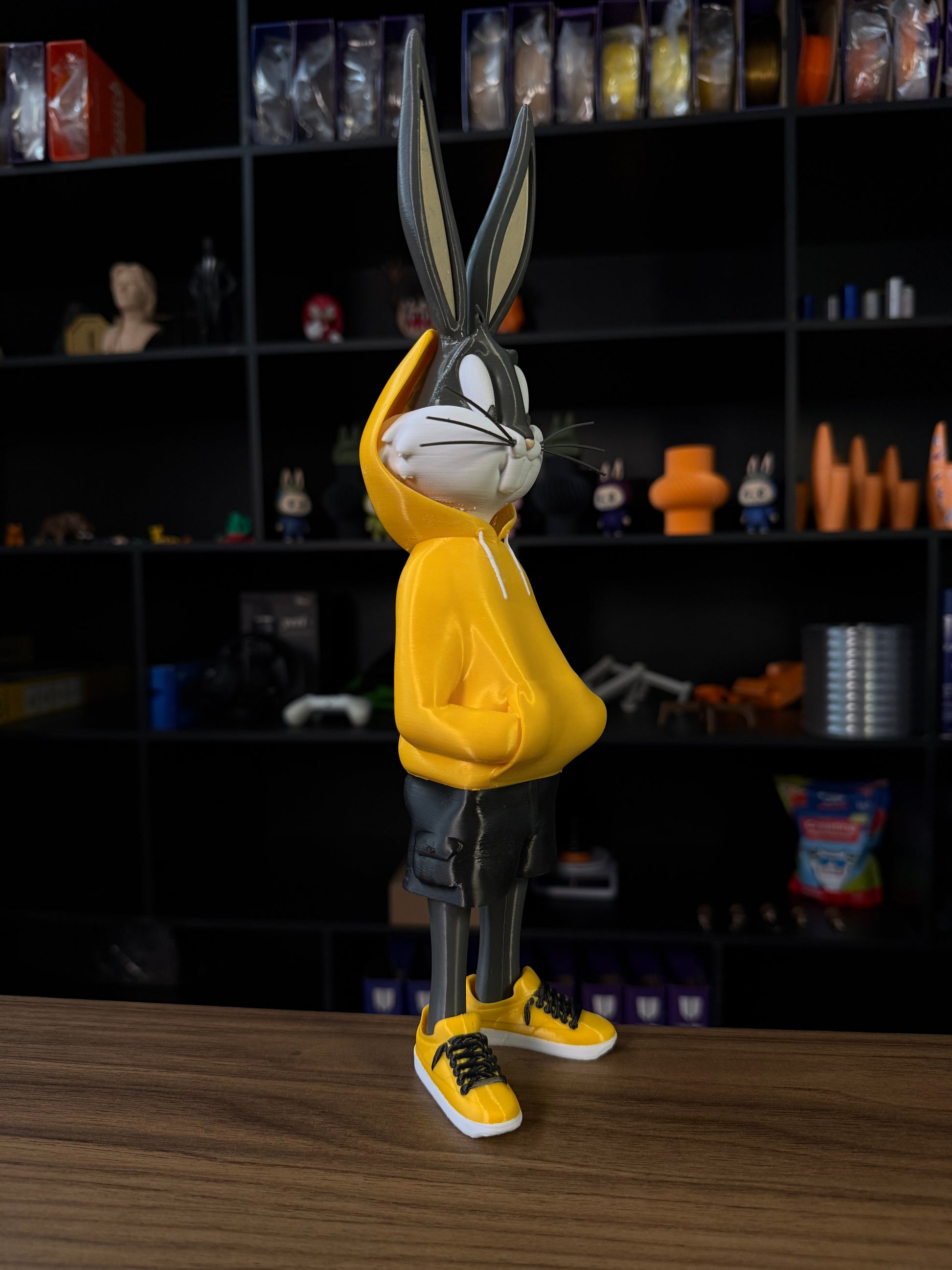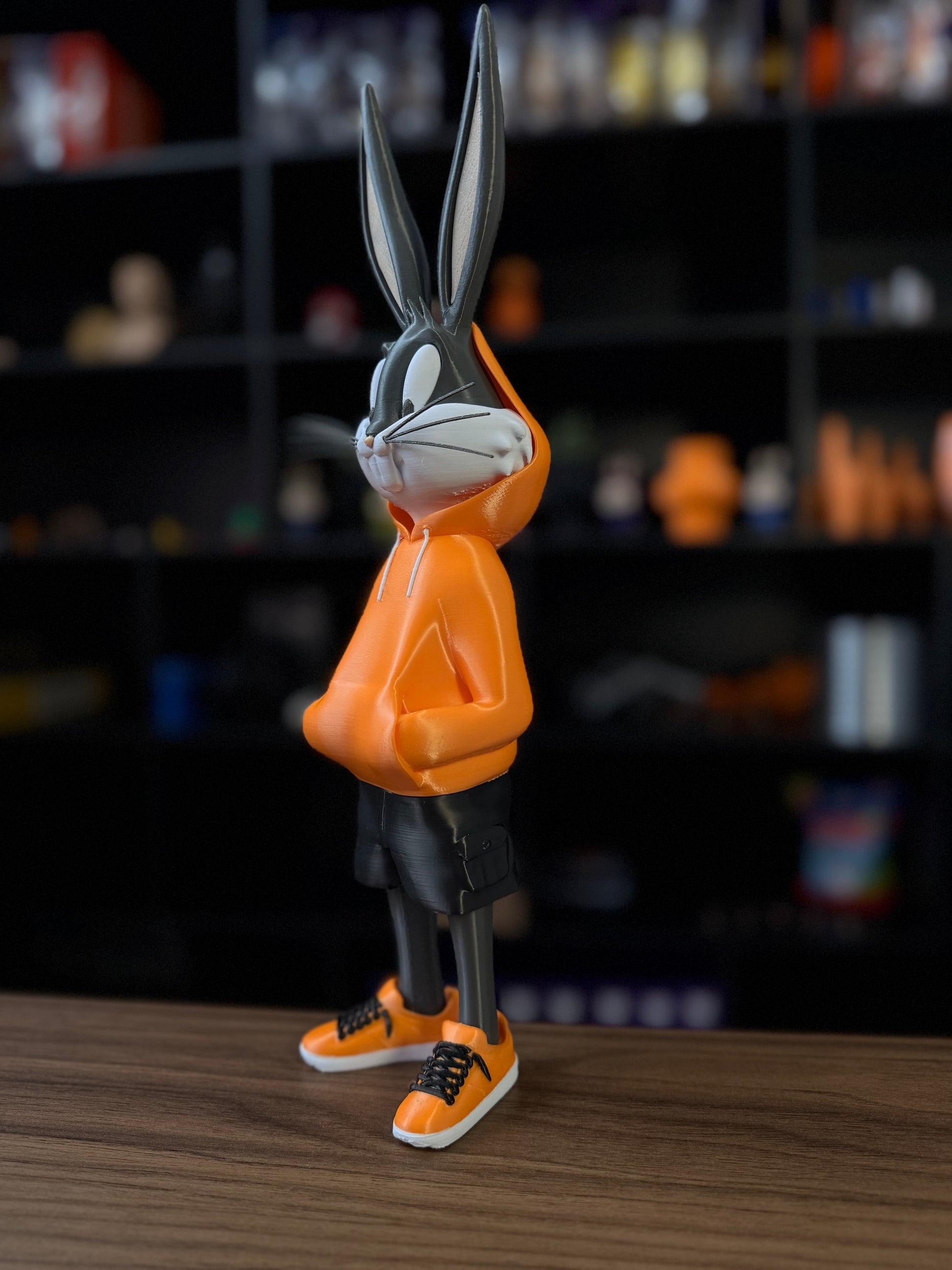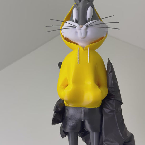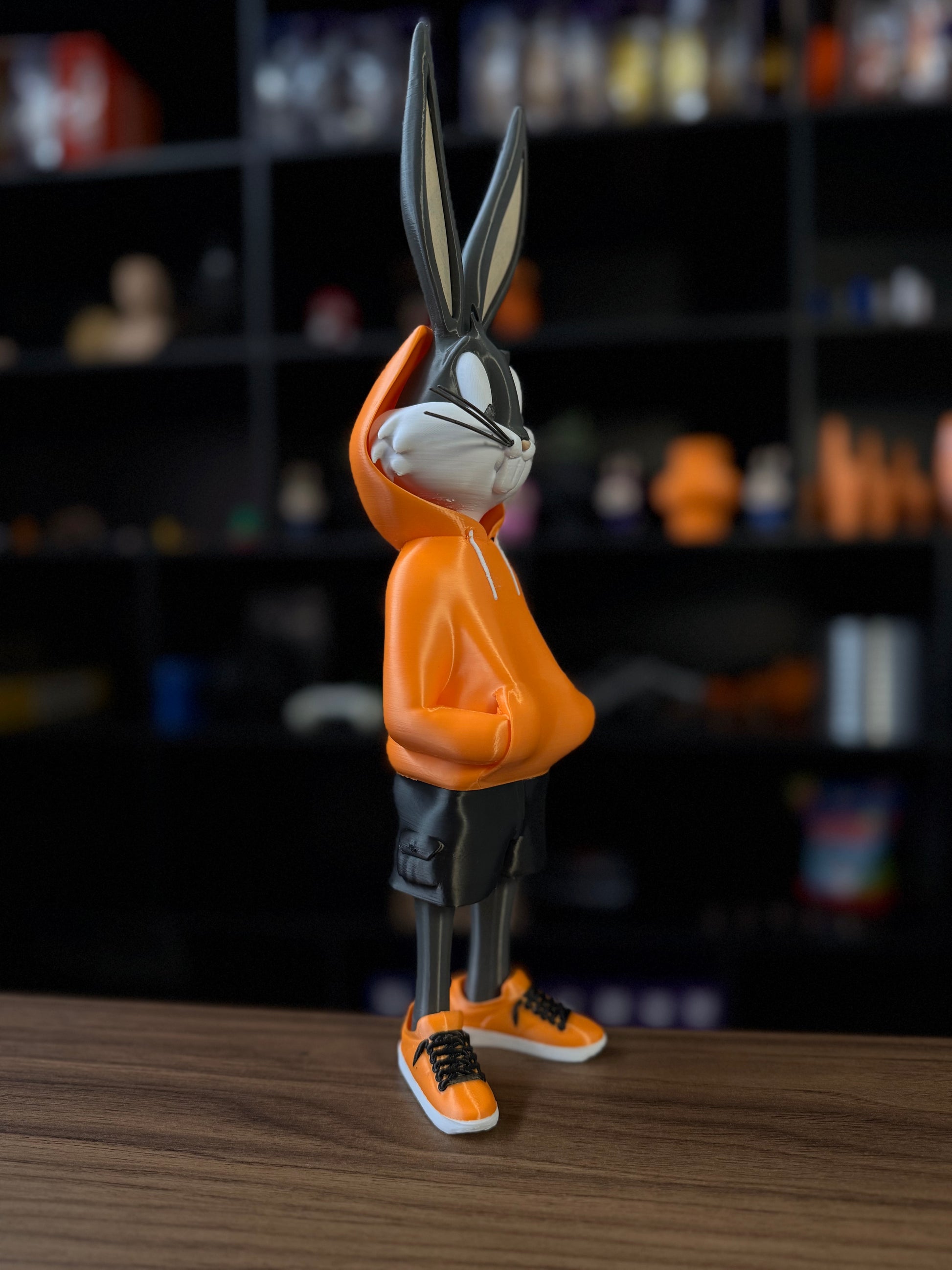Escultura do Personagem Pernalonga do universo dos Looney Tunes, agora com um toque urbanizado.
